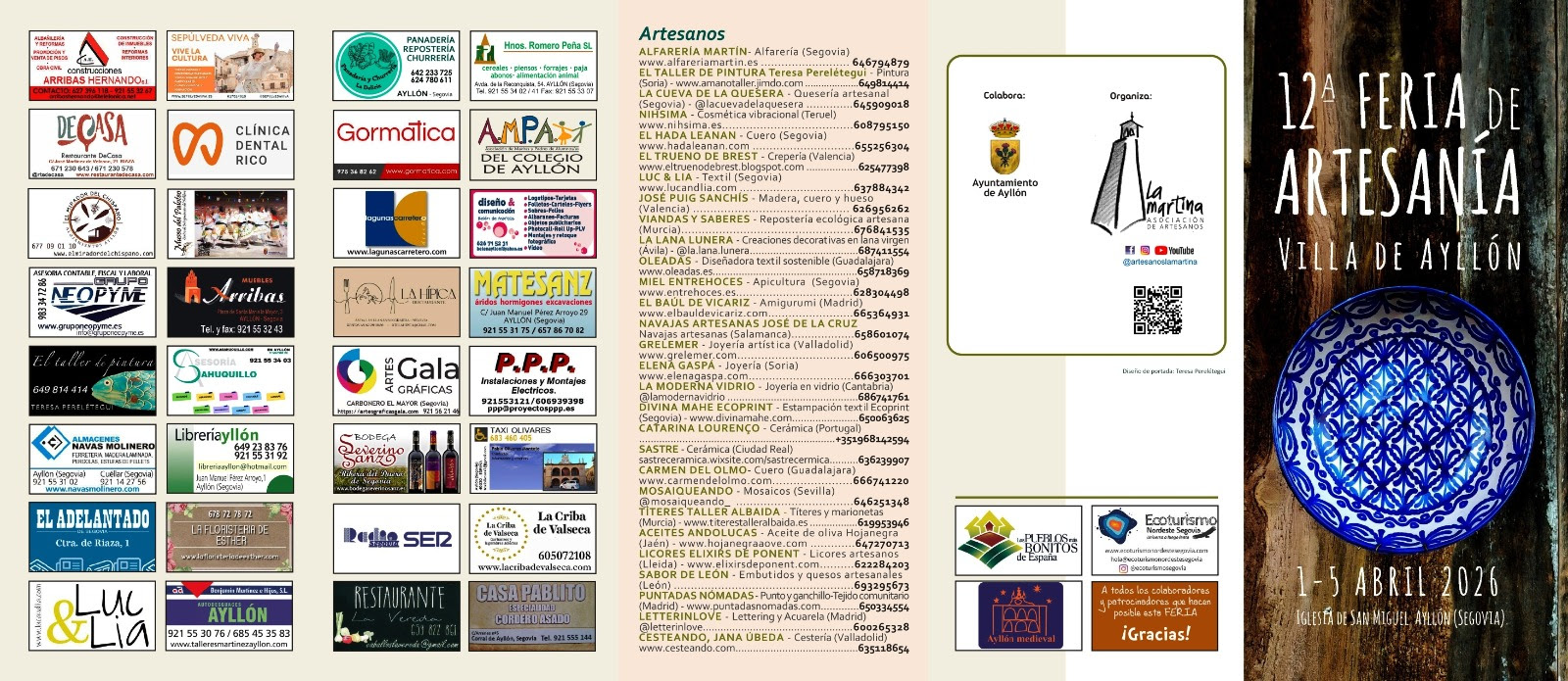 La 12ª Feria de Artesanía Villa de Ayllón se celebrará del 1 al 5 de abril de 2026 en el corazón del municipio medieval de Ayllón, aprovechando los días de Semana Santa para convertir sus calles y plazas en un escaparate del trabajo artesanal. La Asociación de Artesanos La Martina, organizadora del evento desde sus inicios, ha puesto ya en marcha los preparativos de una edición que reunirá a 29 artesanos y artesanas de diferentes oficios y que ofrecerá, además de exposición y venta, una programación cultural con talleres, demostraciones y actuaciones para todos los públicos.