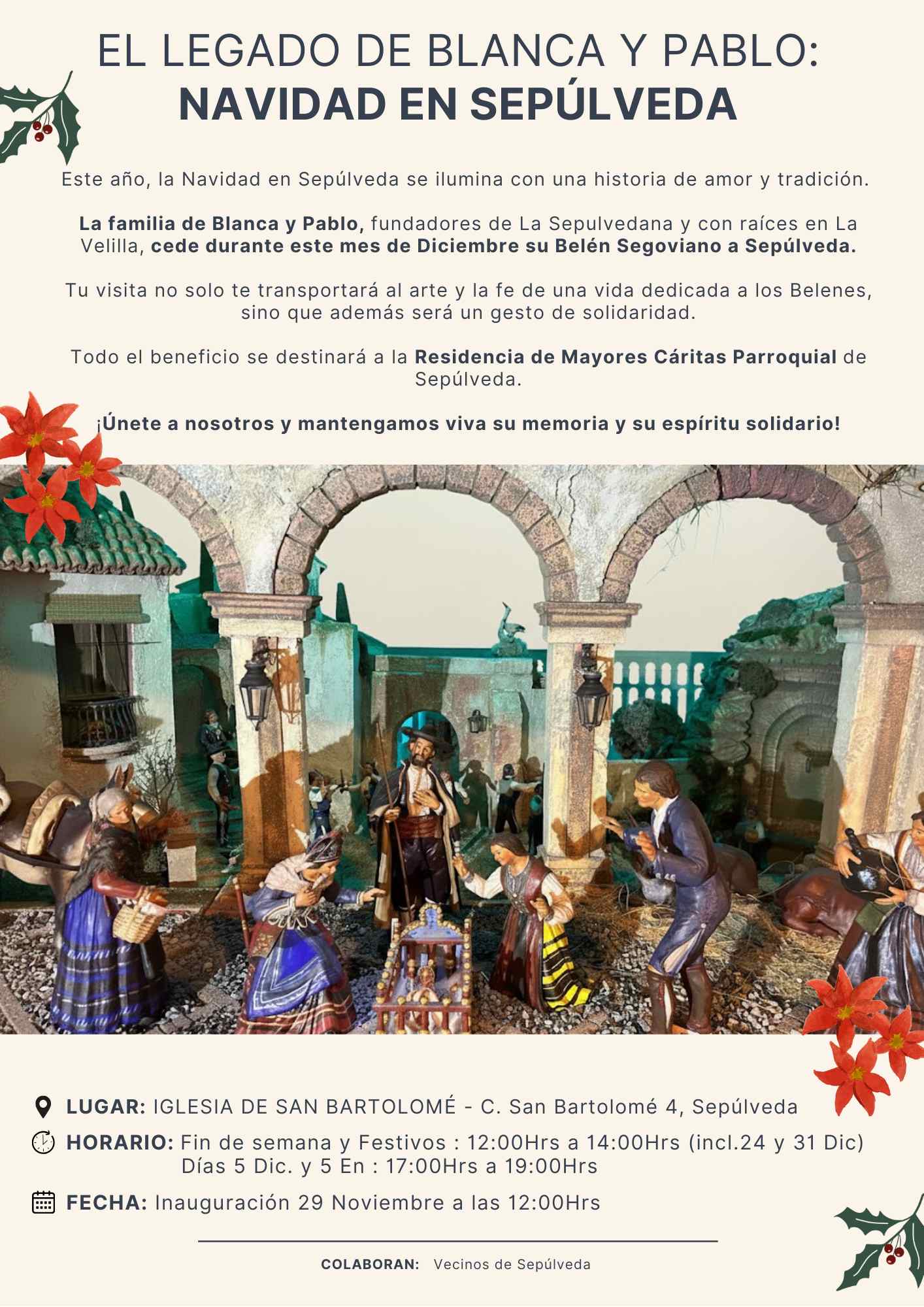"Sepúlveda acogerá un Belén inspirado en Segovia desde este sábado. El legado de la familia de Blanca y Pablo" El “Belén Segoviano” de la familia Martín-Berrocal podrá visitarse desde este fin de semana y hasta el 11 de enero en la iglesia de San Bartolomé de Sepúlveda.