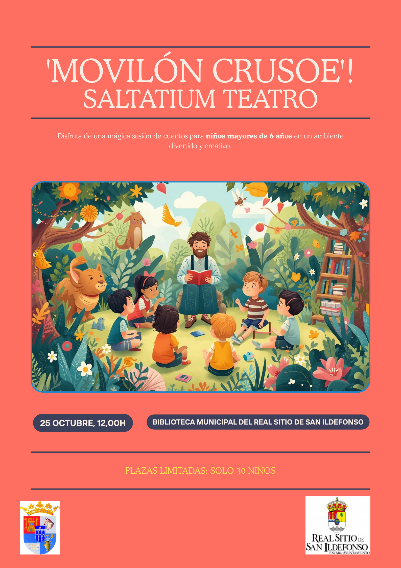 12:00h. Dentro de la Campaña Animación a la Lectura 2025, “MOVILÓN CRUSOE”, espectáculo para peques de más de 6 años, con Saltatium. Biblioteca Municipal del Real Sitio de San Ildefonso. Plazas limitadas (30 niños).
