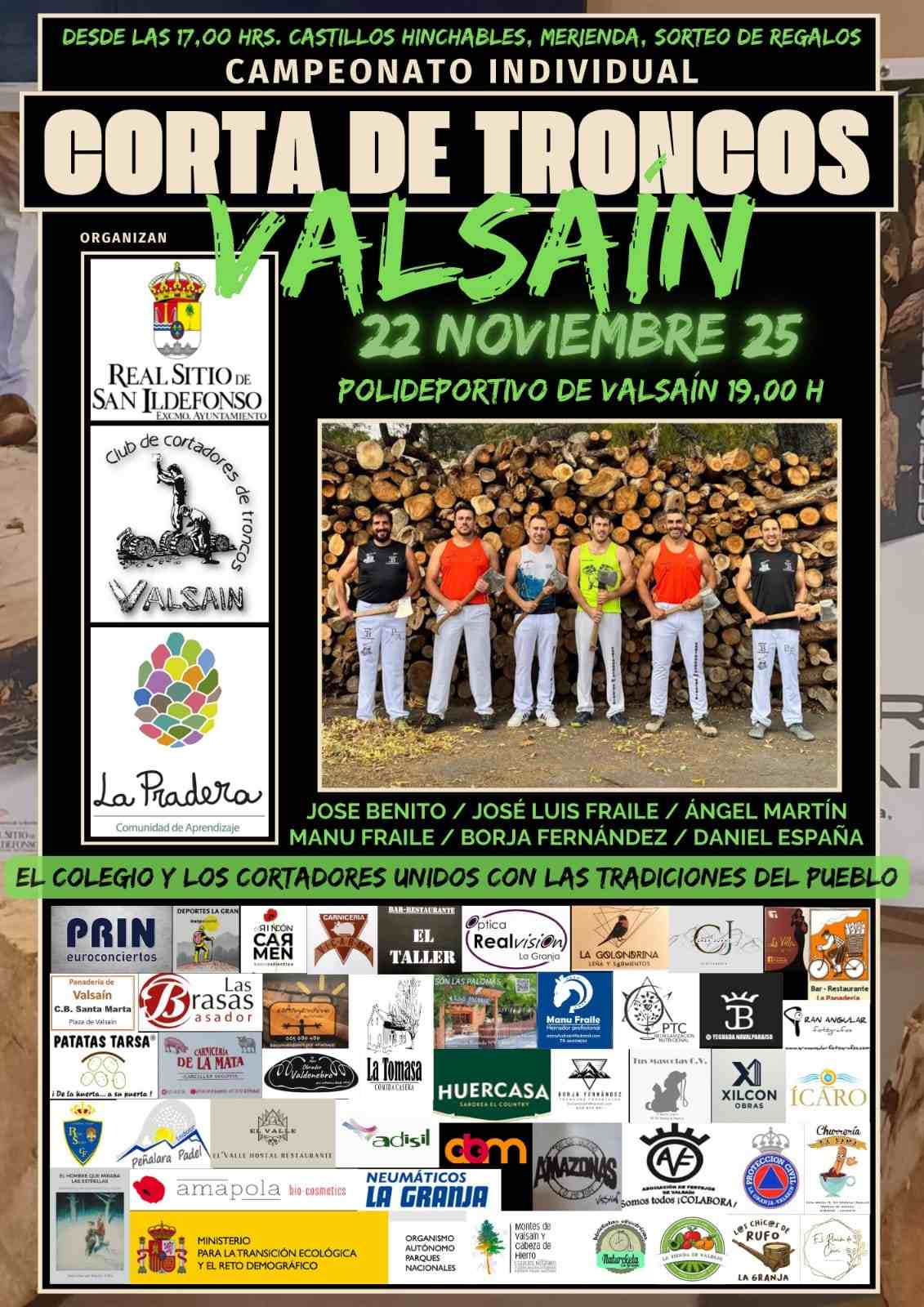 19:00h. Campeonato individual corta de troncos. El colegio y los cortadores unidos con las tradiciones del pueblo. A partir de las 17:00h. habrá castillos hinchables, merienda y sorteo de regalos. Lugar: Polideportivo de Valsaín.
