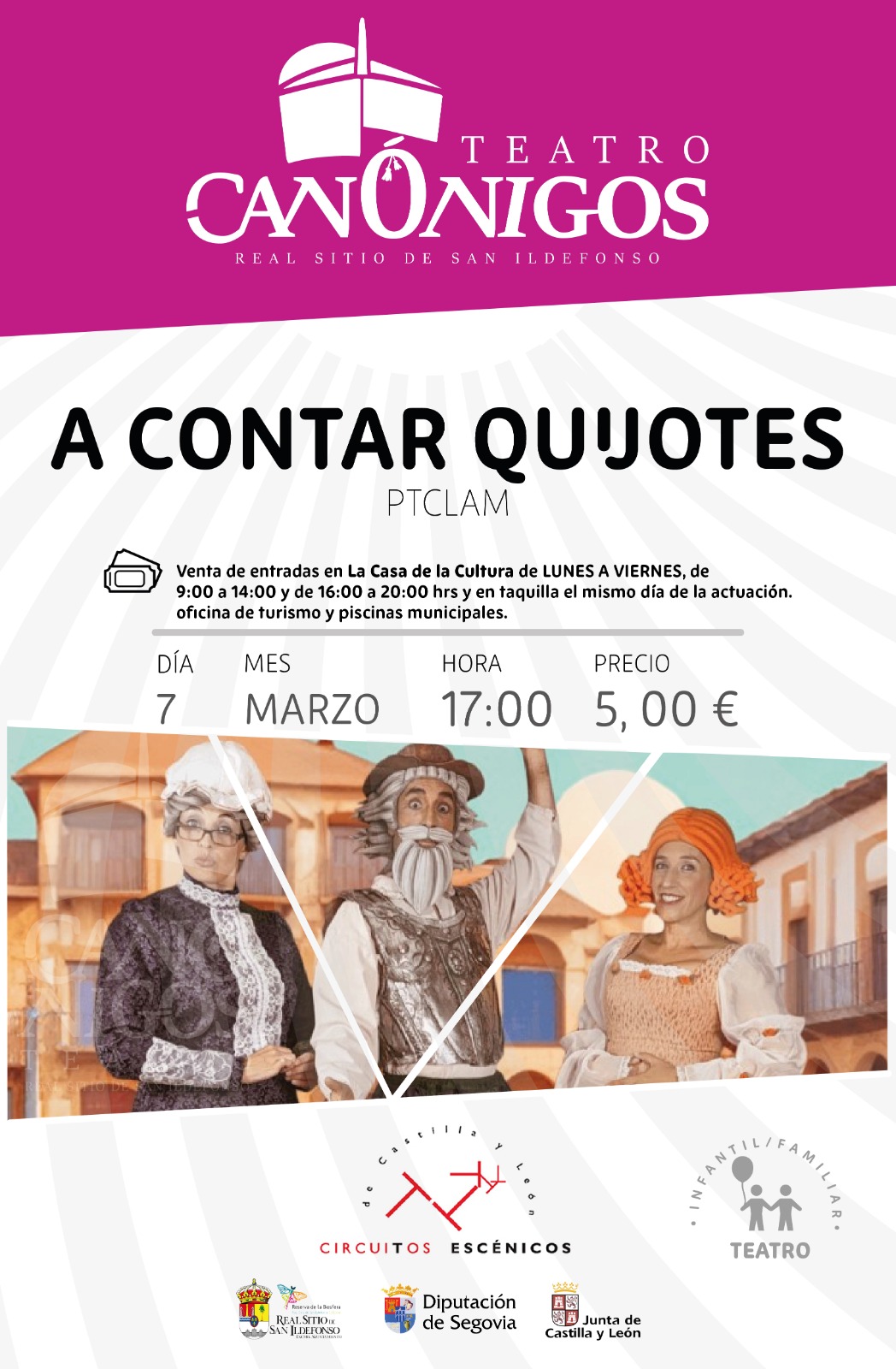 Venta de entradas en la Casa de la Cultura (Pza. del Matadero), en la Oficina de Turismo y piscinas municipales del Real Sitio de San Ildefonso, en su horario habitual y en la taquilla del teatro desde una hora antes del inicio del espectáculo. El precio de las entradas oscila entre 5€ y 7€.