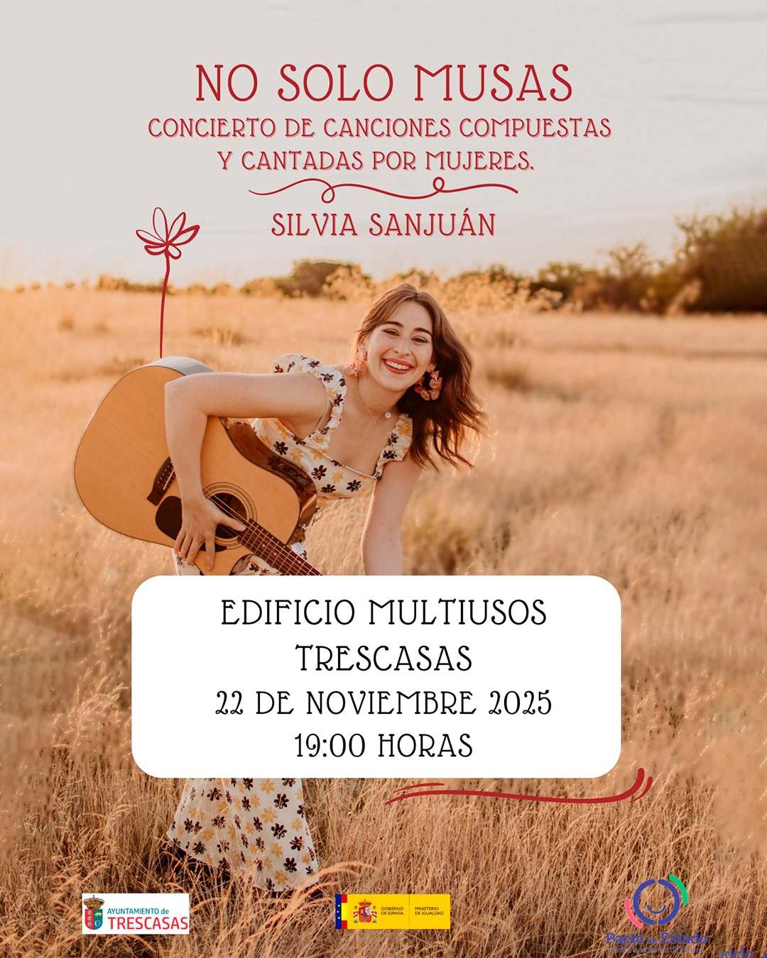 El próximo 22 de noviembre a las 19:00 h, el Multiusos de Trescasas acogerá el concierto “No solo musas” de Silvia Sanjuán, un espectáculo de voz y guitarra que reivindica el papel de la mujer en la sociedad a través de canciones de autoras e intérpretes en español como Ana Belén, Rozalén, Amaral, Mari Trini, Raffaella Carrá o Chavela Vargas, entre otras.