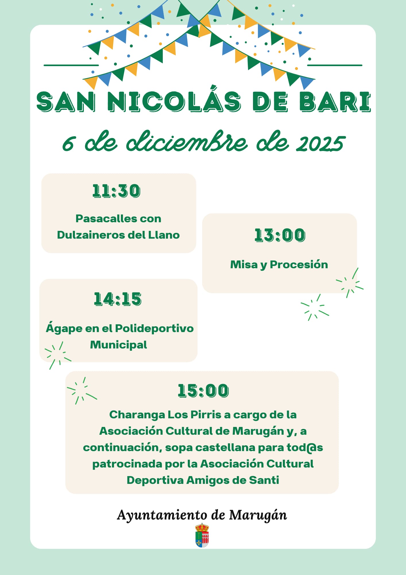 El municipio segoviano de Marugán se encuentra inmerso en ultimar los preparativos para acoger un fin de semana repleto de alegría, música y tradición con motivo de la celebración de la festividad de San Nicolás de Bari. Una popular cita que tendrá lugar este sábado, 6 de diciembre, y que aunará un abanico de diversas actividades para el deleite de los públicos de todas las edades y gustos.