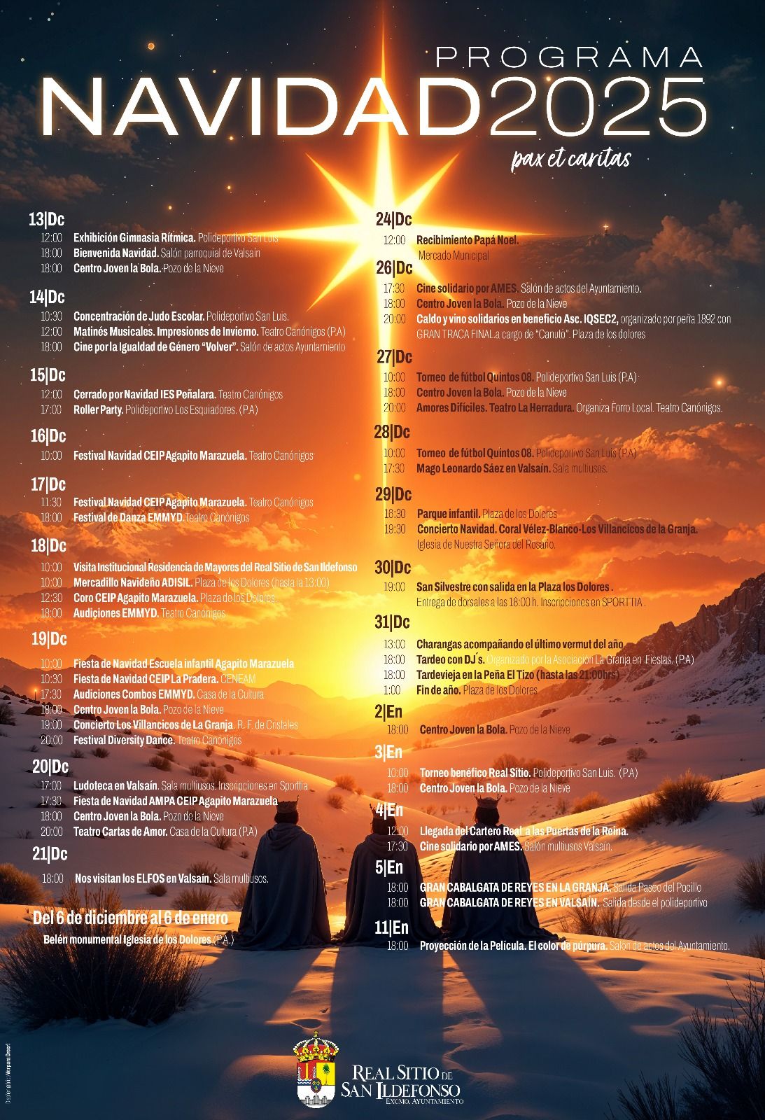 Programación prevista para esta época de fiestas y celebraciones que el Ayuntamiento del Real Sitio de San Ildefonso ha organizado con la inestimable colaboración de colectivos y entidades locales. Un programa con actividades familiares, culturales y deportivas creado con el objetivo de que nuestros vecinos y visitantes disfruten de estos días de ocio.