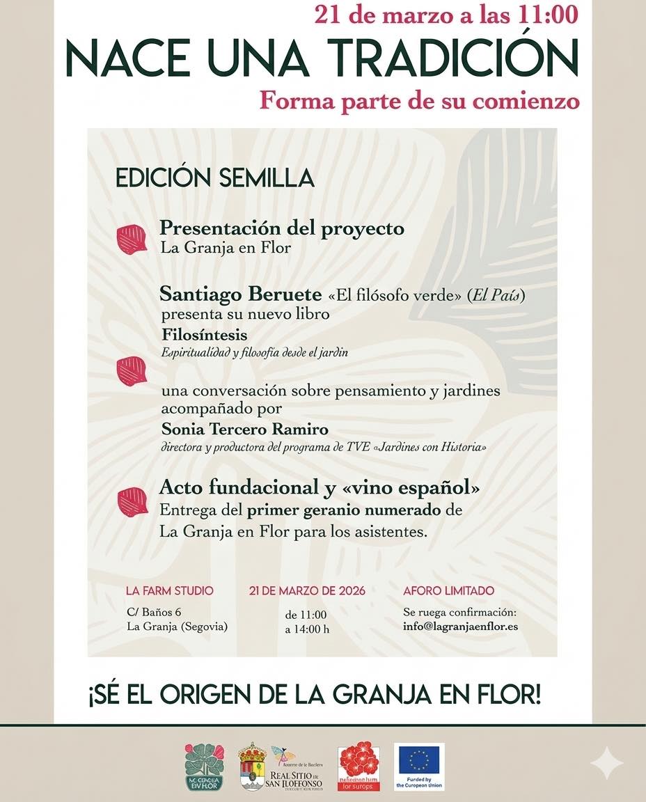 Presentación del proyecto, presentación del nuevo libro de Santiago Beruete, “el filósofo verde” (El País): Filosíntesis. Espiritualidad y filosofía desde el jardín, en conversación con Sonia Tercero Ramiro, directora y productora del programa de TVE Jardines con Historia.