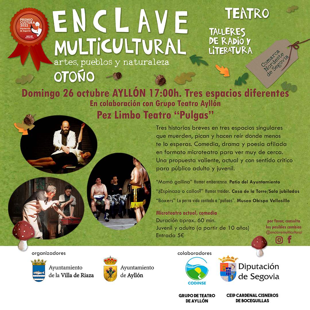 Tres días de programación bajo el título “Locos por el Teatro” donde Enclave Multicultural participa con dos obras “Una rueda que da vueltas” de Proyecto Almealera y “Pulgas” de Pez Limbo Teatro. La primera, aúna teatro documento, teatro de objetos y materiales y narración oral. Basado en un proceso de entrevistas con habitantes de una comarca rural de Ávila, trata sobre cómo se sostenía la vida en los pueblos a partir de una serie de vivencias de la última generación viva de molineros y molineras de agua. La segunda plantea tres historias breves que muerden, pican y hacen reír donde menos te lo esperas. Comedia, drama y poseía afilada en formato microteatro para ver muy de cerca en tres espacios singulares de la Villa de Ayllón; “Mamá gallina” Patio del Ayuntamiento “¿Espinazo o callos?” Casa de la Torre y “Boxers” Museo Obispo Vellosillo. Completa su programa la compañía amateur Musicales 3C con el teatro musical “Seis, El Musical”