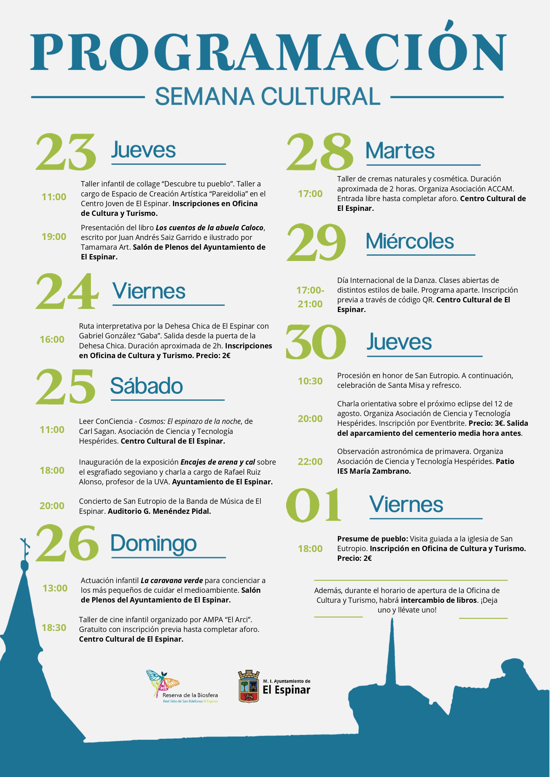 Programación de la Semana Cultural de El Espinar 2026 que se celebrará del 23 de abril al 1 de mayo de 2026.
