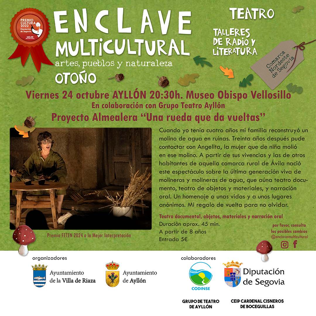 Tres días de programación bajo el título “Locos por el Teatro” donde Enclave Multicultural participa con dos obras “Una rueda que da vueltas” de Proyecto Almealera y “Pulgas” de Pez Limbo Teatro. La primera, aúna teatro documento, teatro de objetos y materiales y narración oral. Basado en un proceso de entrevistas con habitantes de una comarca rural de Ávila, trata sobre cómo se sostenía la vida en los pueblos a partir de una serie de vivencias de la última generación viva de molineros y molineras de agua. La segunda plantea tres historias breves que muerden, pican y hacen reír donde menos te lo esperas. Comedia, drama y poseía afilada en formato microteatro para ver muy de cerca en tres espacios singulares de la Villa de Ayllón; “Mamá gallina” Patio del Ayuntamiento “¿Espinazo o callos?” Casa de la Torre y “Boxers” Museo Obispo Vellosillo. Completa su programa la compañía amateur Musicales 3C con el teatro musical “Seis, El Musical”