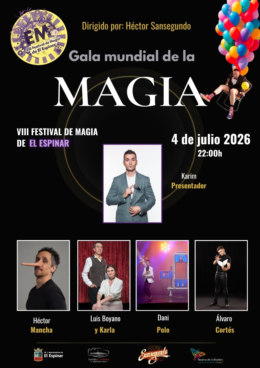Dentro del VIII Festival internacional de magia de El Espinar “El Espinar con EM de Magia”, dirigido por el conocido mago y humorista Héctor Sansegundo, tendremos un año más a los mejores magos del mundo en la “Gala Mundial de la Magia”.