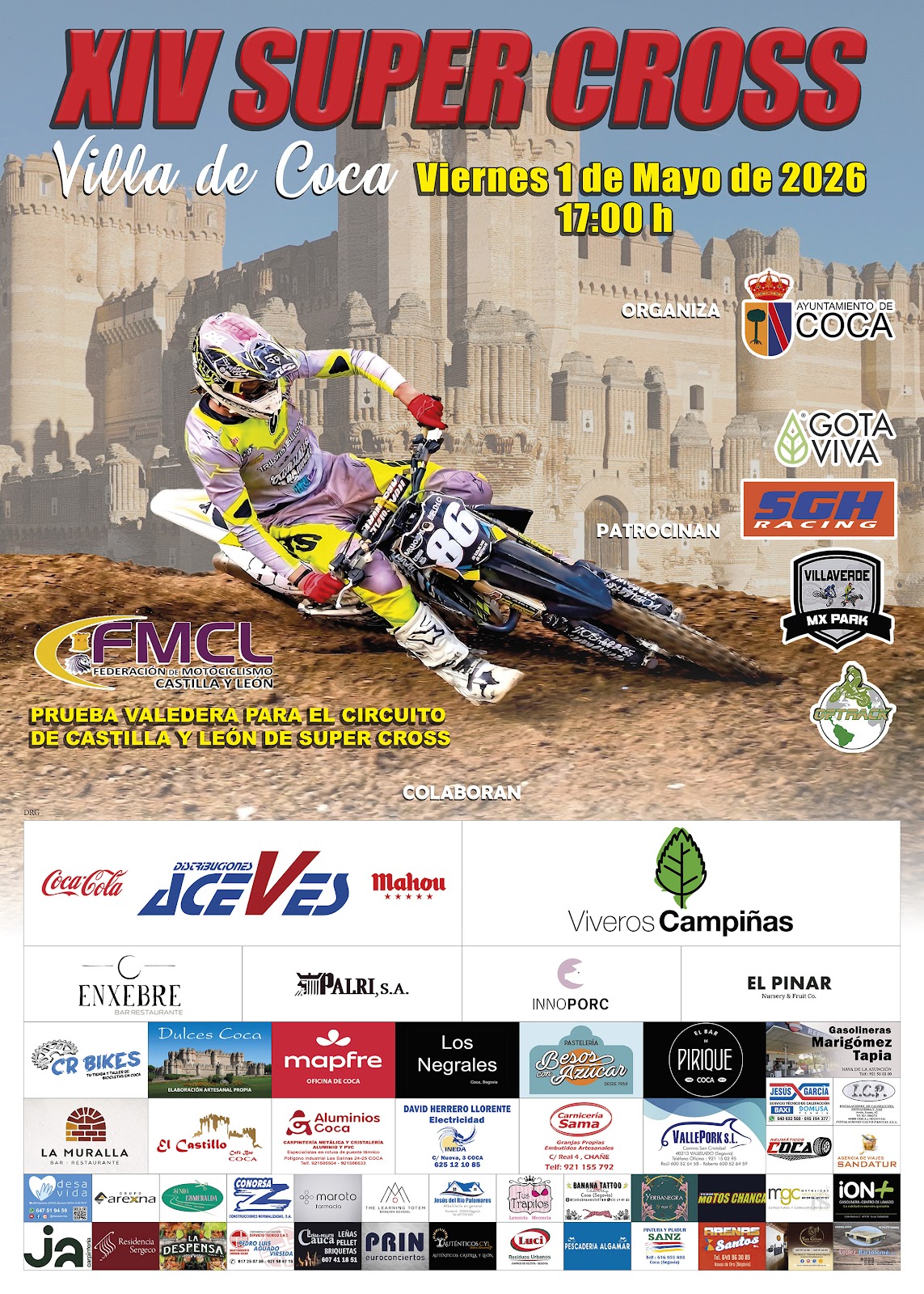 La localidad segoviana de Coca volverá a convertirse en un referente del motocross regional con la celebración de la XIV edición del Supercross ‘Villa de Coca’, que tendrá lugar el viernes 1 de mayo a las 17:00 horas. El evento, organizado por el Ayuntamiento de Coca con la colaboración de la Federación de Motociclismo de Castilla y León (FMCL), forma parte del calendario oficial del Circuito de Supercross de Castilla y León, por lo que será puntuable para la clasificación general del campeonato.
