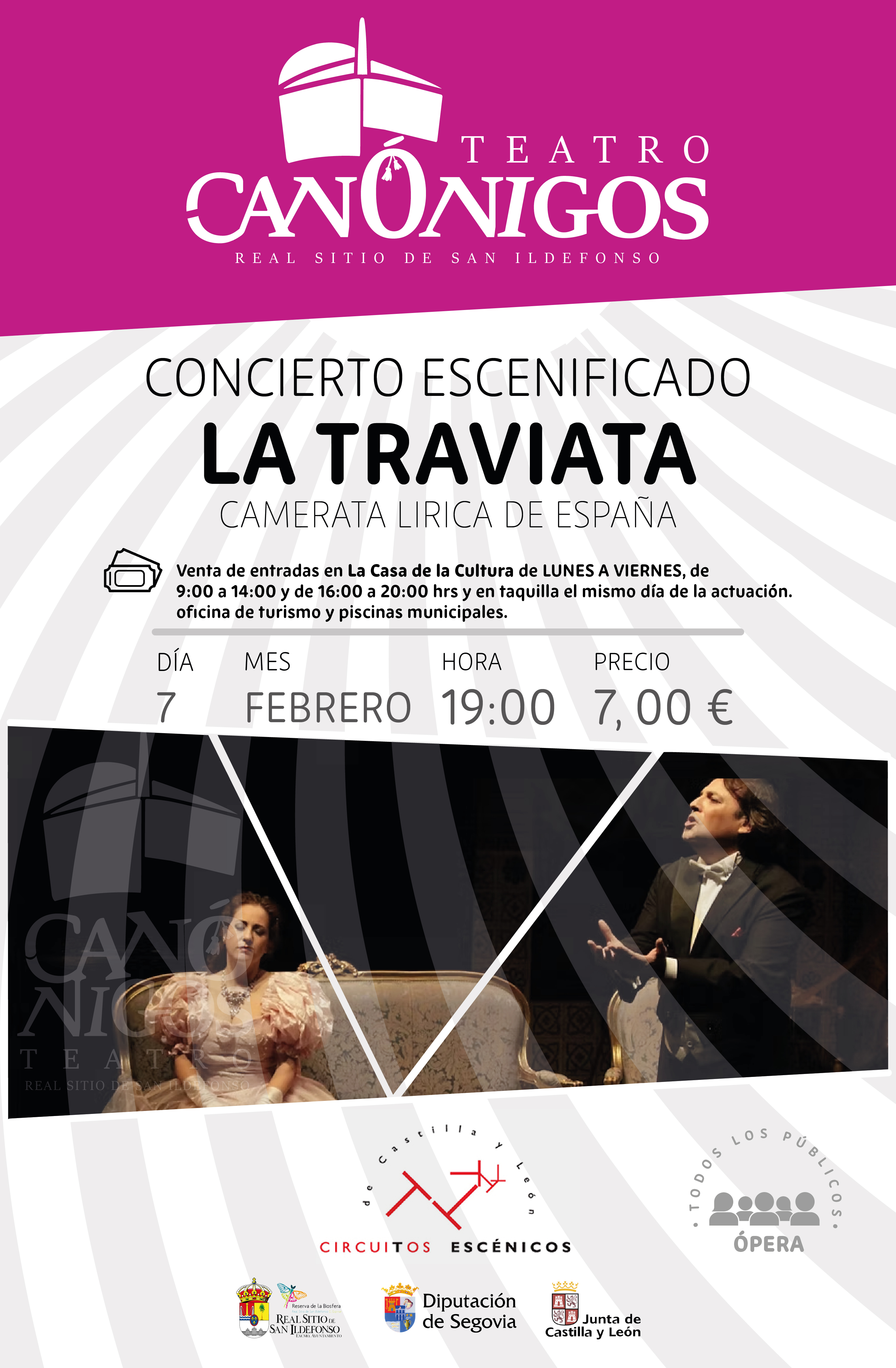 Venta de entradas en la Casa de la Cultura (Pza. del Matadero), en la Oficina de Turismo y piscinas municipales del Real Sitio de San Ildefonso, en su horario habitual y en la taquilla del teatro desde una hora antes del inicio del espectáculo. El precio de las entradas oscila entre 5€ y 7€.