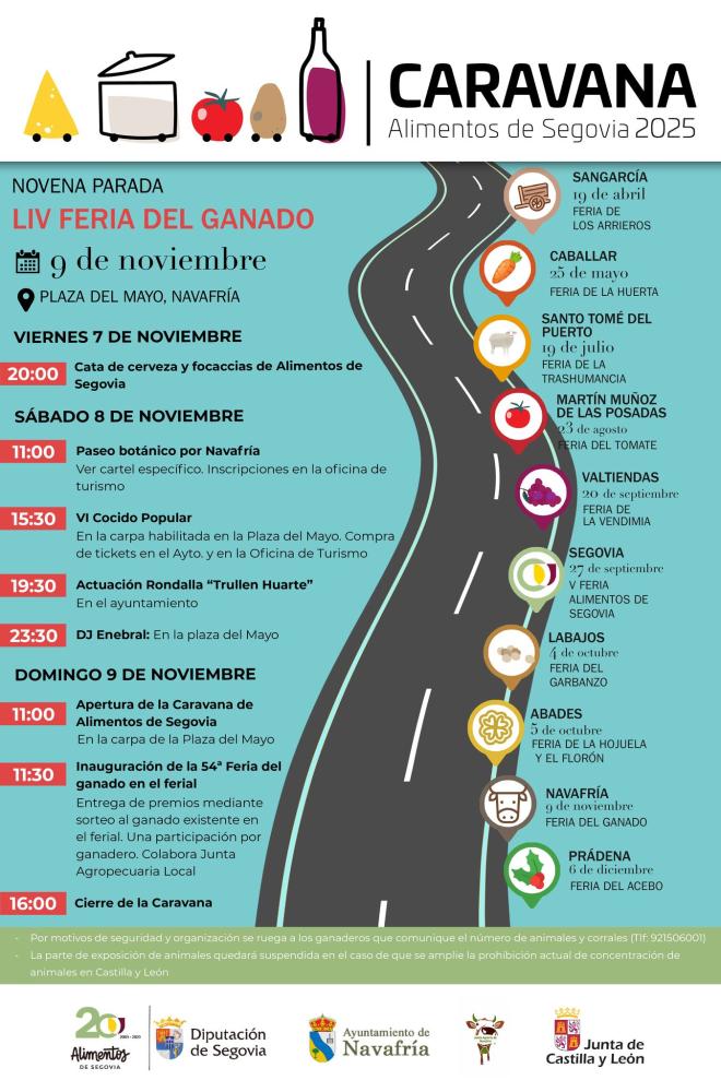 La localidad segoviana de Navafría volverá a convertirse en punto de encuentro para el sector agroganadero y la gastronomía provincial con la celebración de la LIV Feria del Ganado, que tendrá lugar los días 7, 8 y 9 de noviembre si las restricciones establecidas por la dermatosis nodular contagiosa no son prorrogadas. El evento, organizado por el ayuntamiento de la localidad con la colaboración de la Diputación de Segovia y su marca agroalimentaria, está acompañado de la novena parada de la Caravana de Alimentos de Segovia, una iniciativa que recorre la provincia promocionando los productos locales y el trabajo de sus productores y que en Navafría se celebrará independientemente de que la Feria pueda cumplir o no con su programación completa.