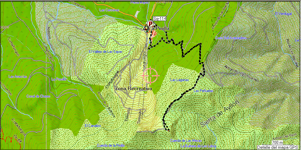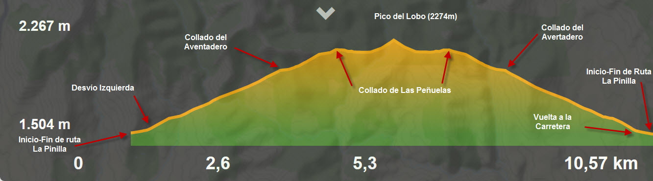 Por delante tenemos 2 kilómetros de camino en zigzag entre pinares, hasta llegar al Collado del Aventadero (2.000m), donde encontramos otro cartel, marcando Pico del Lobo (Derecha), Puerto de la Quesera (Izquierda). Llegando al final de este tramo, en el último giro del camino hacia la izquierda, tenemos una pequeña explanada en forma de mirador. Los pinos desaparecen y podremos disfrutar de hermosas vistas de toda la meseta. En días claros, se puede ver la cordillera cantábrica, si esta está nevada.