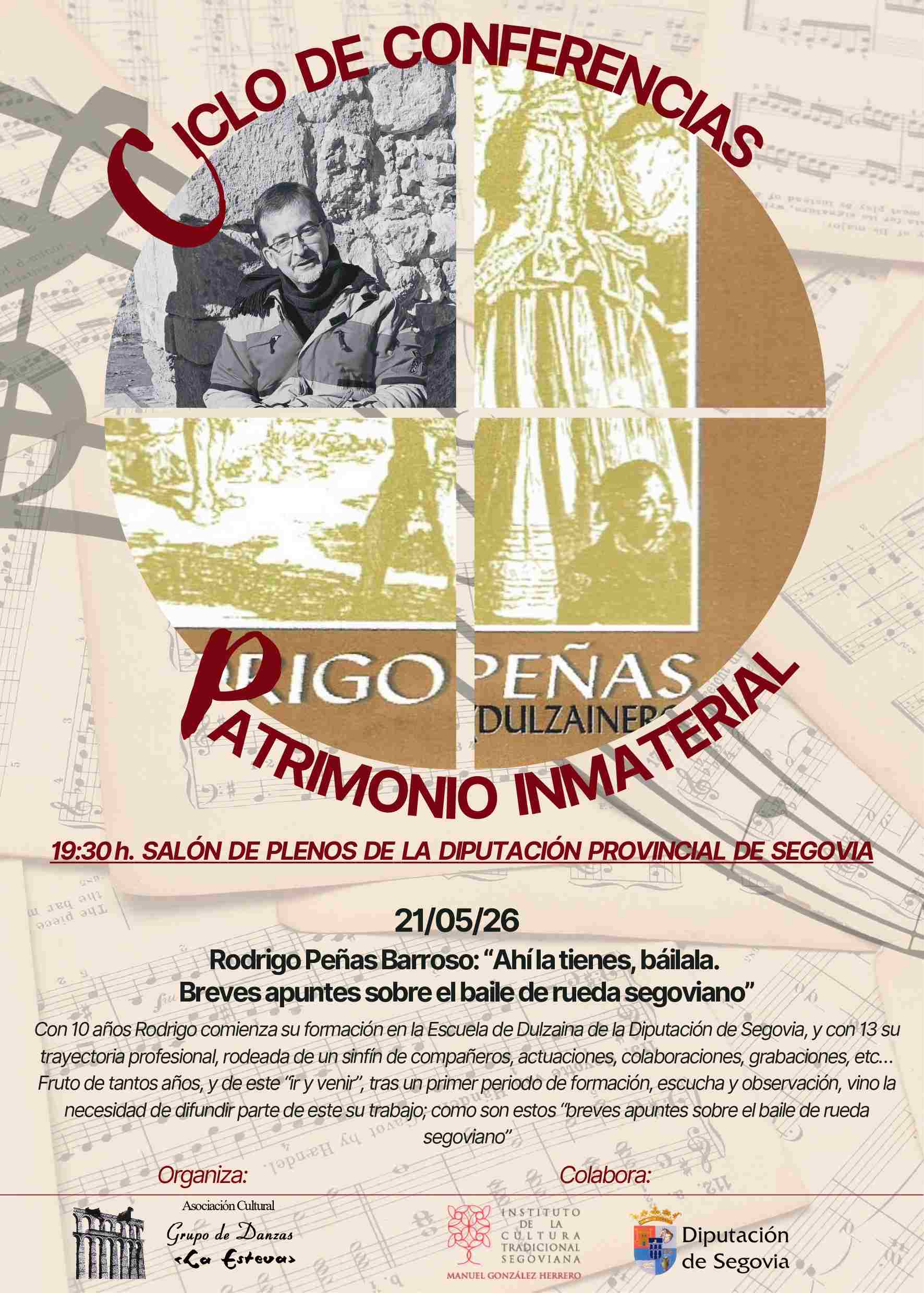Finalmente, el 21 de mayo, Rodrigo Peñas cerrará el programa con “Ahí la tienes, báilala, breves apuntes sobre el baile de rueda segoviano”, una aproximación al baile tradicional desde la experiencia y la divulgación. Tras una extensa formación, la cual comenzó con tan solo diez años, su trayectoria profesional ha estado marcada por un sinfín de compañeros, actuaciones y colaboraciones que le han servido para difundir parte de su trabajo como estos breves sobre el baile de rueda.