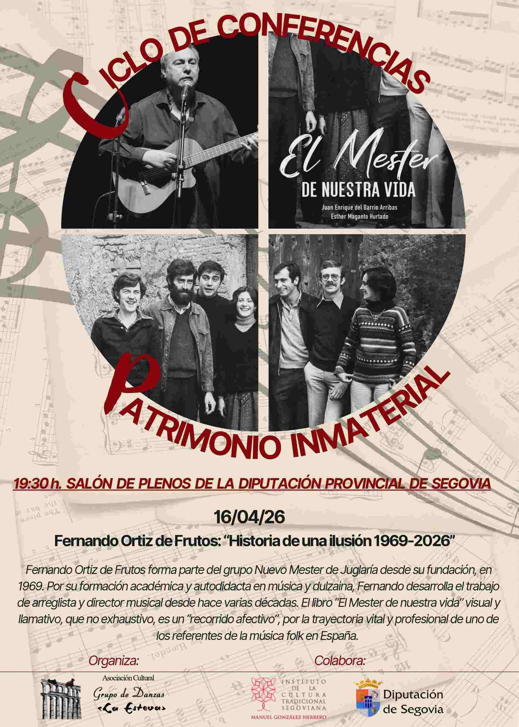 El ciclo continuará el 16 de abril con Fernando Ortiz, miembro fundador del grupo segoviano Nuevo Mester de Juglaría, quien ofrecerá la charla “Historia de una ilusión, 1969 – 2026”. A través del libro “El Mester de nuestra vida”, de Juan Enrique del Barrio y Esther Maganto, Ortiz recorrerá la trayectoria vital y profesional de este referente de la música folk en España que ha “enamorado y encandilado con sus cantares a los segovianos, conformándose como un símbolo identitario de nuestra provincia”.