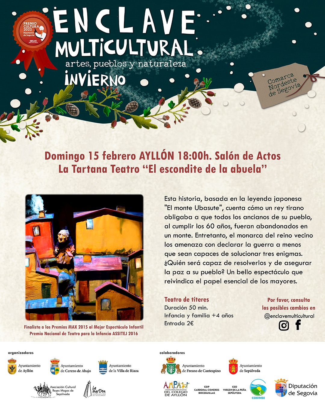 Dos obras centradas en la figura de las personas mayores formarán parte de la programación. "El escondite de la abuela" de La Tartana Teatro se representará en Ayllón el 15 de febrero. La obra, basada en la leyenda japonesa "El monte Ubasute", aborda la relación entre generaciones y el respeto a los ancianos.