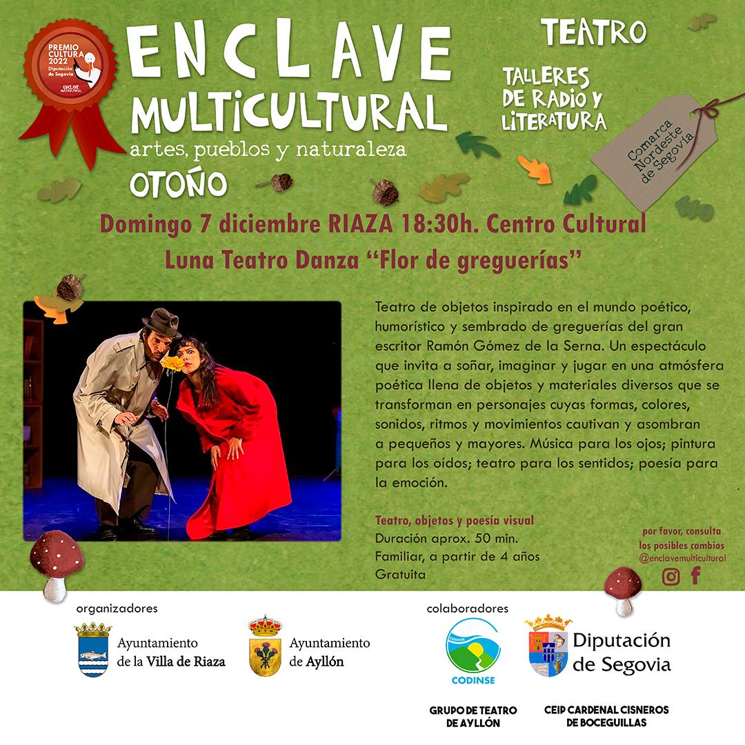 Luna Teatro Danza cerrará el ciclo de otoño el 7 de diciembre en Riza con “Flor de greguerías” propuesta familiar de teatro de objetos inspirado en el mundo poético y humorístico del gran escritor madrileño Ramón Gómez de la Serna, que se desarrolla en una sucesión de poesías visuales que girarán en torno al universo de las greguerías. El espectáculo invita a soñar, a imaginar juegos posibles, se adentra en una atmósfera poética para ofrecer un viaje emotivo y sensorial a los espectadores. Un espacio de juego y de encuentro donde objetos, elementos y materiales diversos se transformarán en personajes, seres animados cuyas formas, colores, sonidos, ritmos y movimientos dibujarán variadas partituras escénicas que cautivan y asombran a pequeños y mayores. Música para los ojos; pintura para los oídos; teatro para los sentidos; poesía para la emoción.