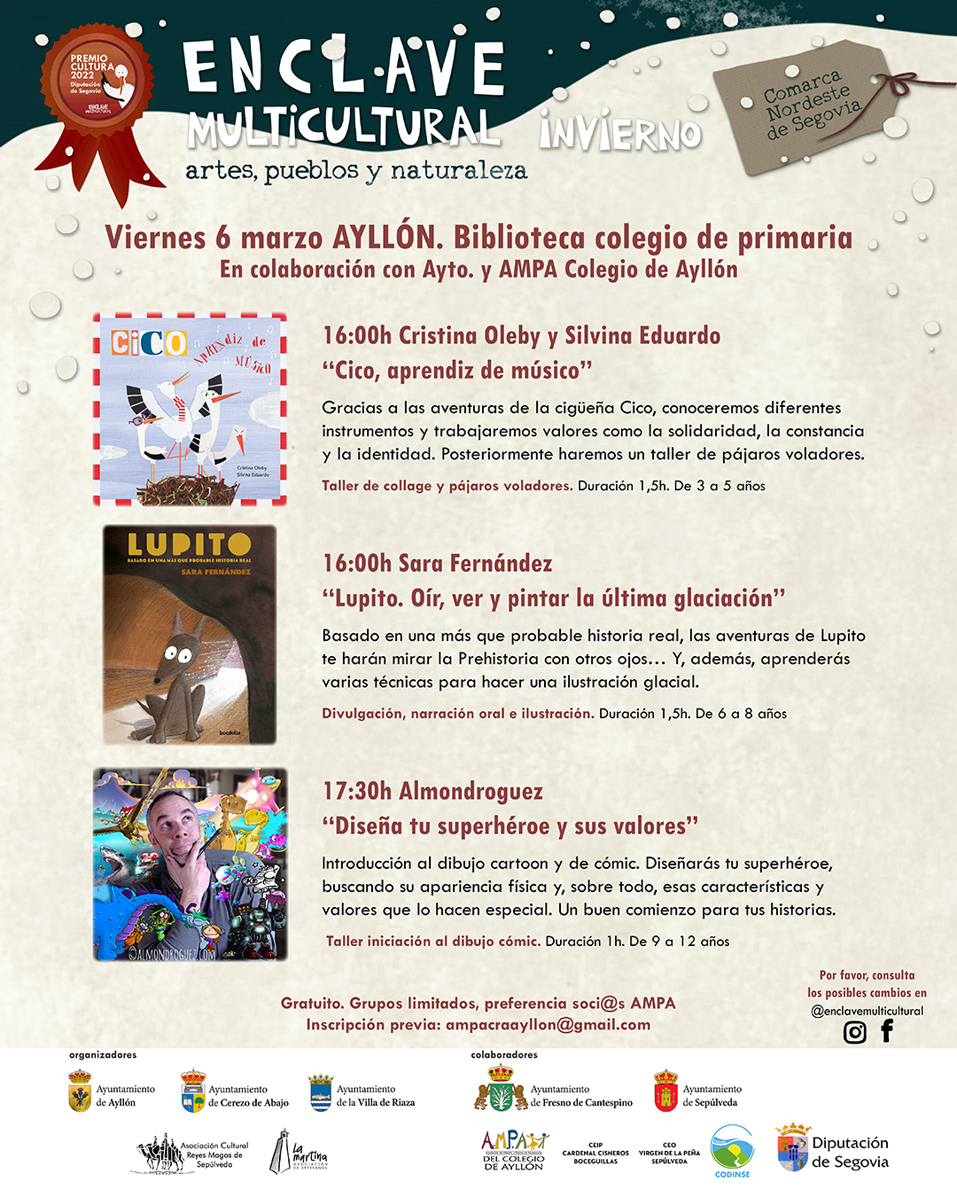 El 6 de marzo, el AMPA del colegio de Ayllón organizará tres talleres. La escritora Cristina Oleby y la ilustradora Silvina Eduardo impartirán un taller de collage inspirado en "Cico, aprendiz de músico". La ilustradora local Sara Fernández conducirá una charla y taller sobre su obra "Lupito". El dibujante Almondróguez ofrecerá un taller de dibujo cartoon y cómic titulado "Dibuja tu superhéroe y sus valores".