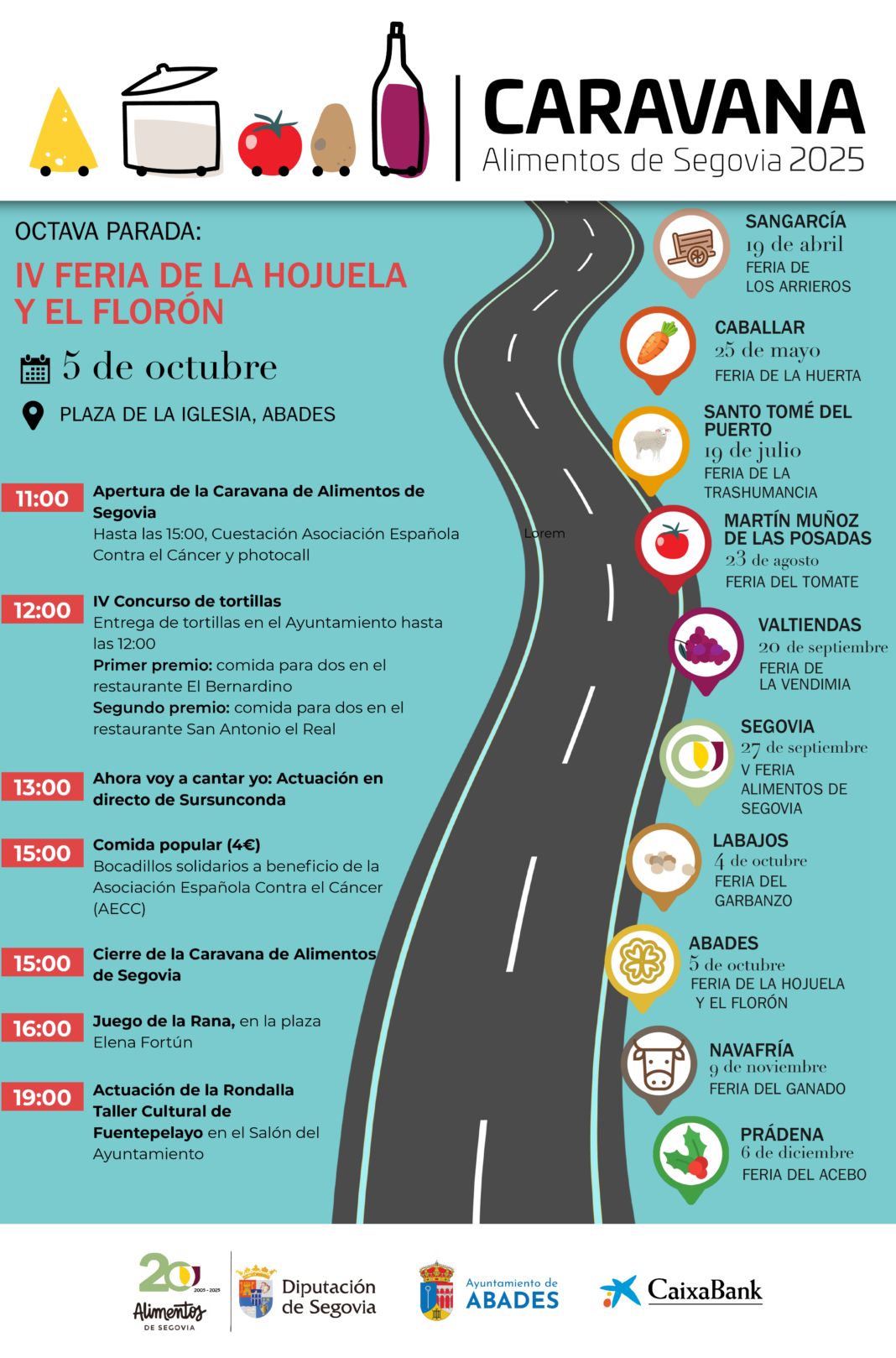 La jornada comenzará a las 11:00 horas con la apertura de la Caravana de Alimentos de Segovia, en la que participarán catorce socios de la marca agroalimentaria provincial: Quesería Artesanal de Sacramenia, Alimentación Los Castillos, La Manitas de Sacramenia, A Tu Gusto!, Ahumados Artesanos Perser, Espirulina Valsaín, Entrehoces, Crema y Chocolate, Clarisas Convento de la Inmaculada, Ahumados HUMA, Bodegas Maeste, La Cruz de Hierro, Vamos a Beer y Bendito Nanno.