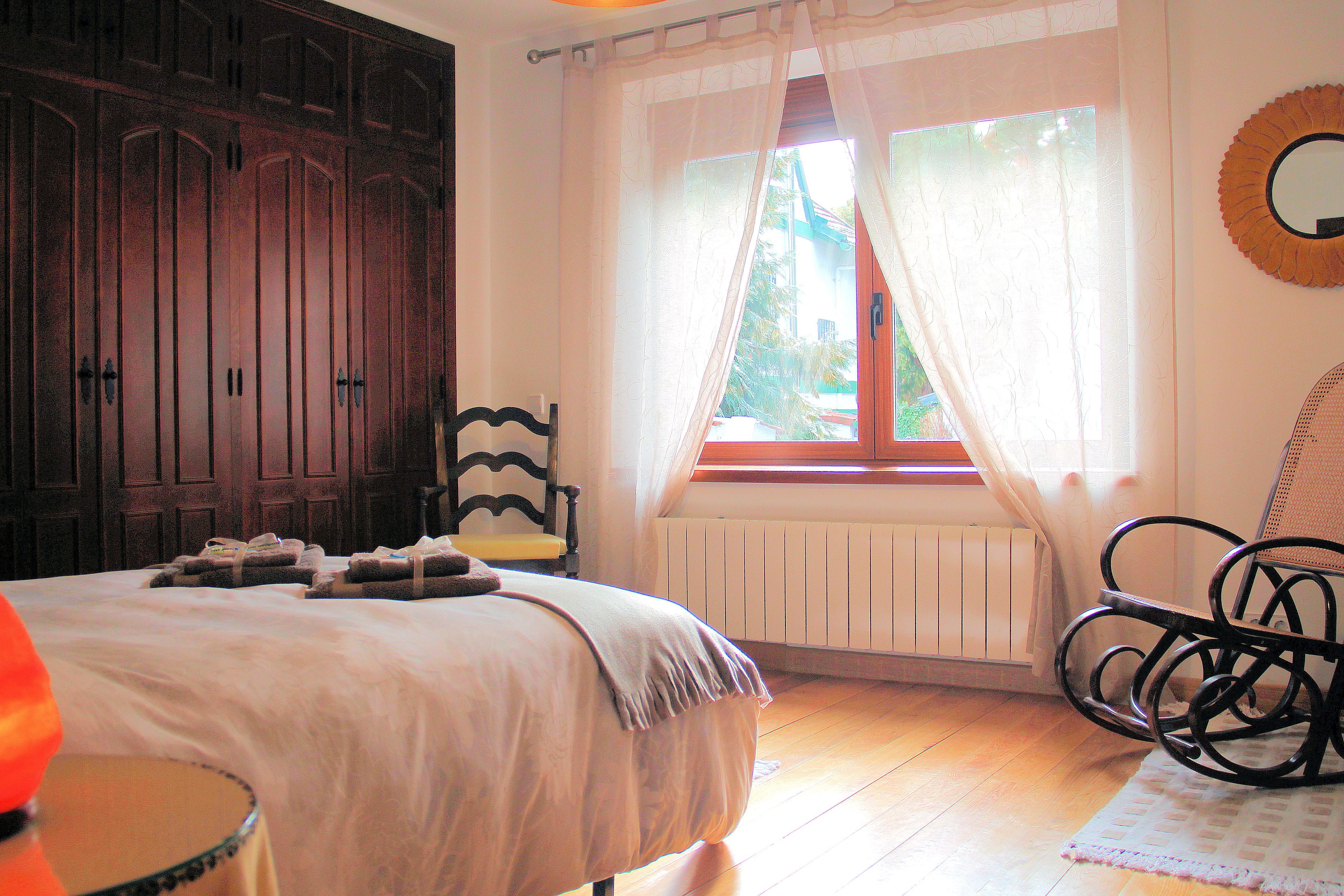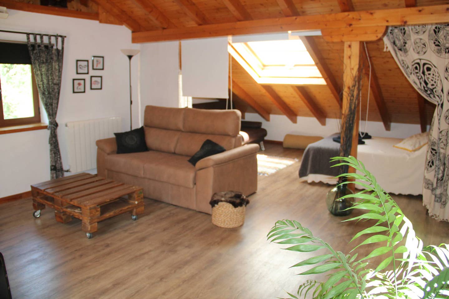 2ª planta: Ático abuhardillado en madera, convertido en gran suite, con cama doble,dos sofá- cama dobles, aseo con plato de ducha y distintas zonas de estar. TV, DVD, música.