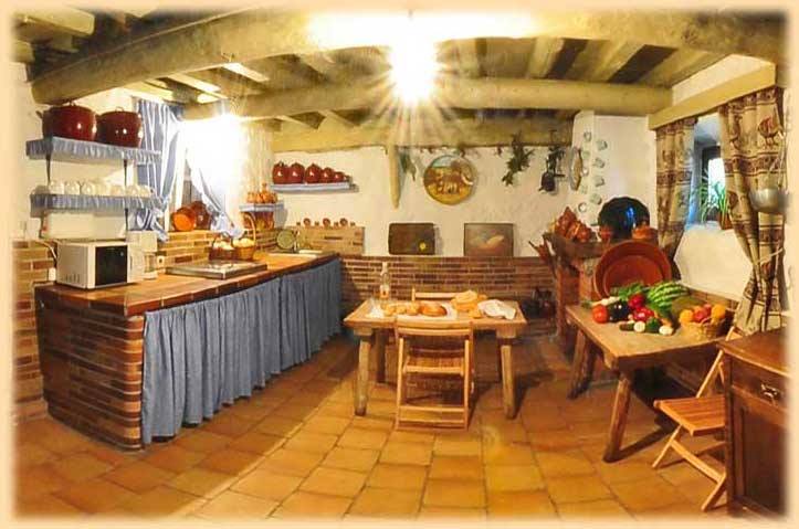 Esteva: Una amplia cama de matrimonio restaurada en madera y estuco, acompaña a un baño completo, con muebles de madera y estilo antiguo.