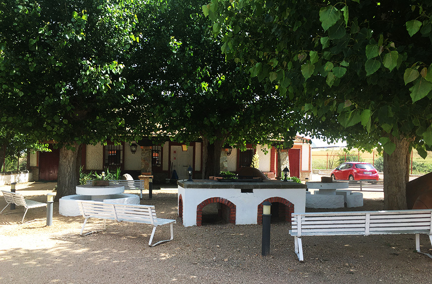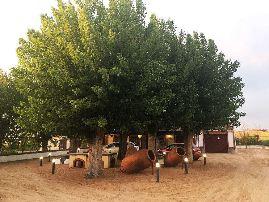 En la finca podemos encontrar una gran barbacoa de leña rodeada de bancos y mesas de rueda de molino, todo ello bajo grandes árboles y tinajas decorativas.