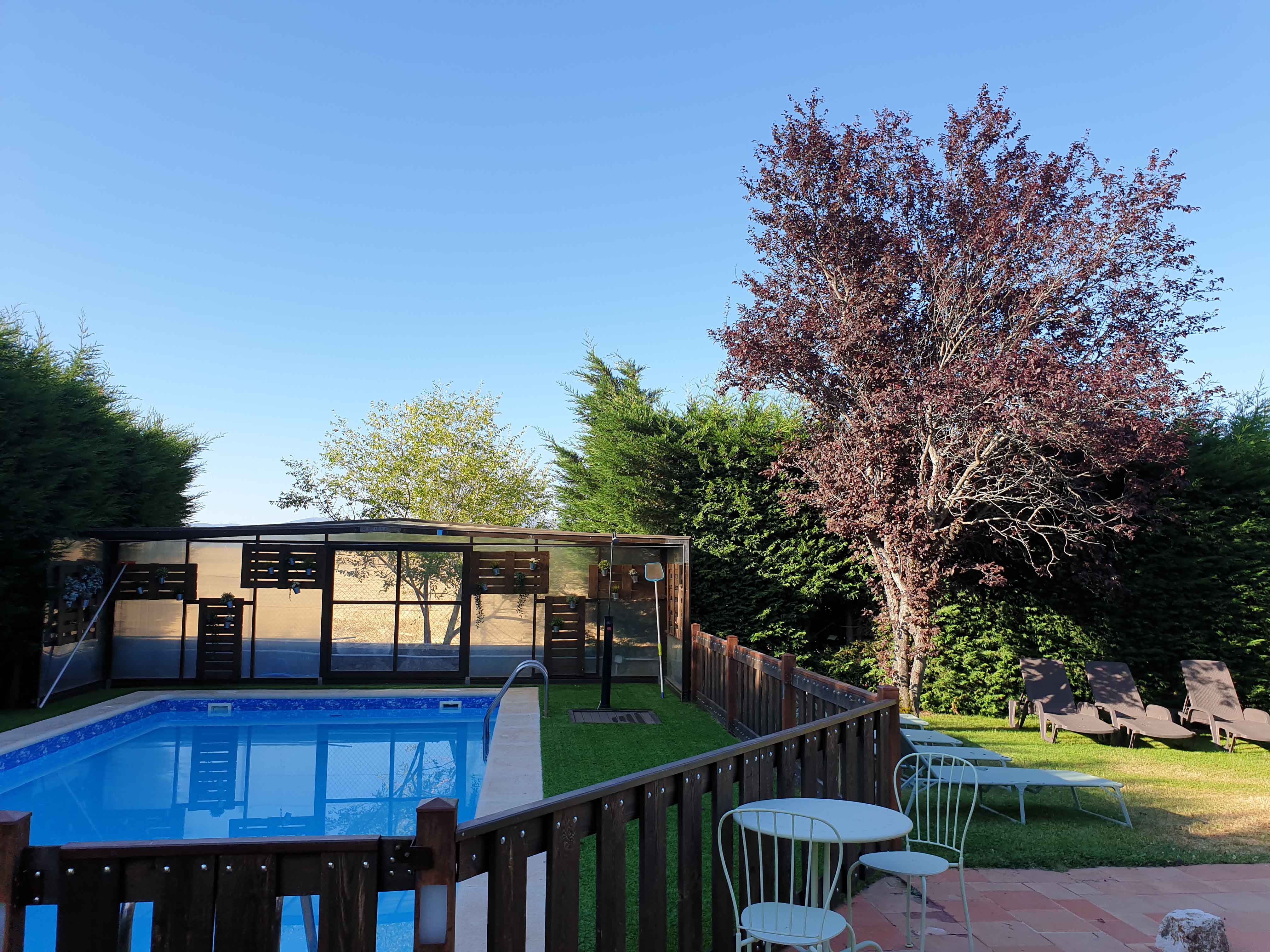 Casa de construcción a la antigua usanza, estilo rústico, con grandes muros de piedra, vigas y suelos de madera; grandes espacios donde disfrutar de la estancia. Cuidada decoración. Equipamiento de menaje de cocina y lencería de camas y baño completos. Amplios y acogedores dormitorios. Piscina cubierta. Jardín, barbacoa, porche amueblado. Salón y bodega con chimenea. Garaje.