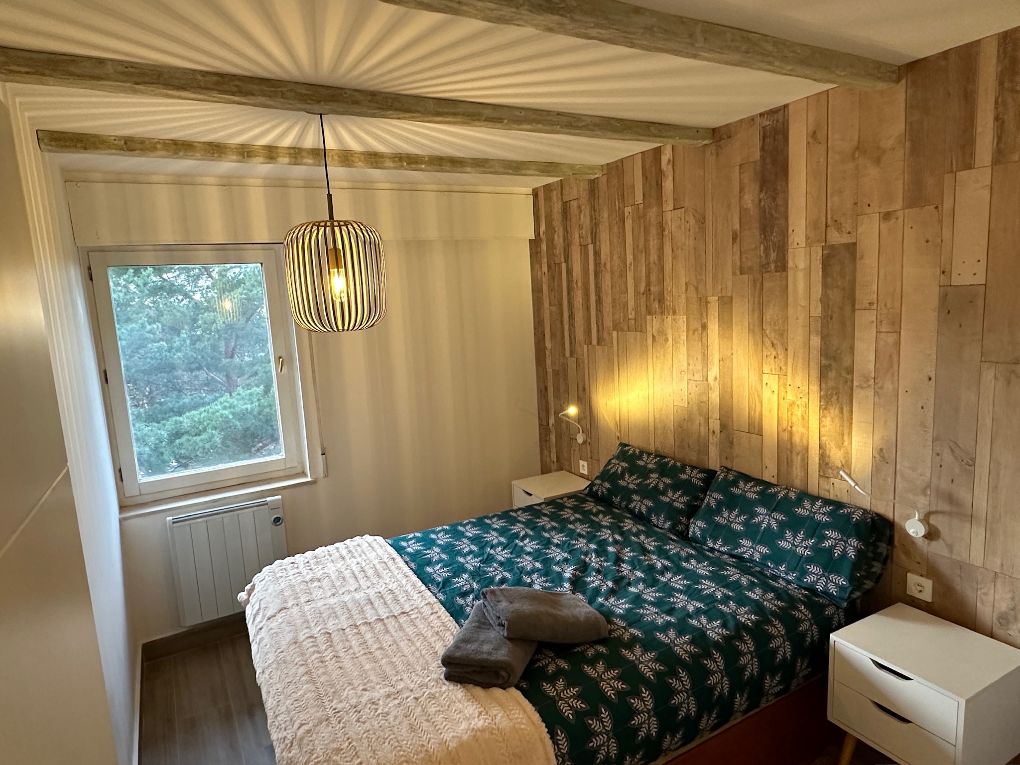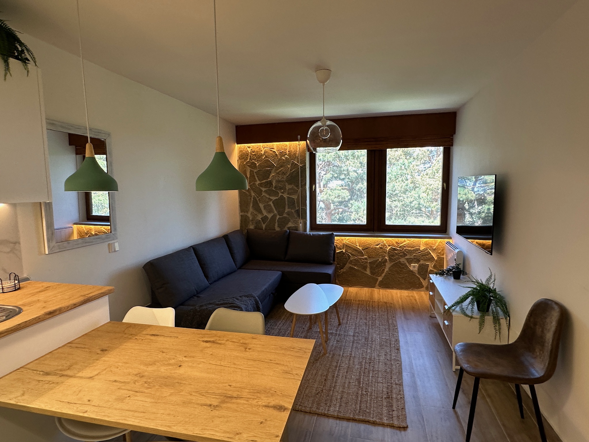 Cuenta con cocina americana abierta al salón, totalmente equipada, y sofá cama para mayor capacidad. El dormitorio principal dispone de cama de matrimonio de 150 cm y decoración de estilo alpino. Baño completo con amplia ducha de 160×80 cm, lavabo e inodoro. Calefacción eléctrica con control Wi-Fi para tu comodidad.
