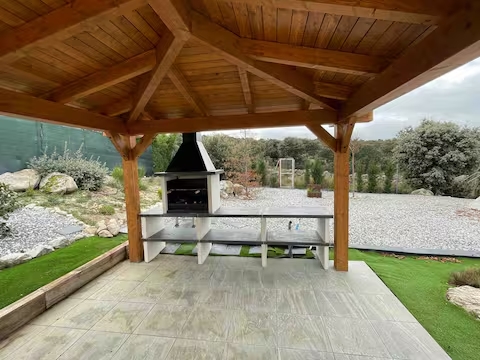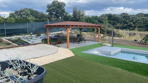 Cuenta con un jardín de 1000 m2 con piscina, gran cenador de madera con vistas al encinar y barbacoa donde disfrutar de agradables veladas.