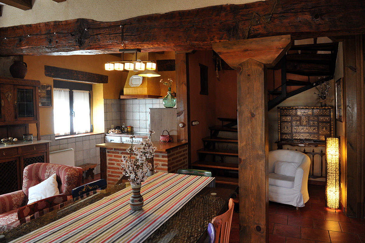 En el salón comedor la decoración rústica de las paredes en piedra vista dotan al comedor de un ambiente rústico y confortable. Parte del mobiliario del salón son antiguos aperos de labranza convertidos en mesas, estanterías, revisteros. Podrás disfrutar también de su chimenea en los días de mas frío. Tiene televisión, chimenea, DVD, equipo de música y una biblioteca. La mesa de comedor en una mesa de trillo y las sillas han sido restauradas y pintadas a mano con vivos colores.