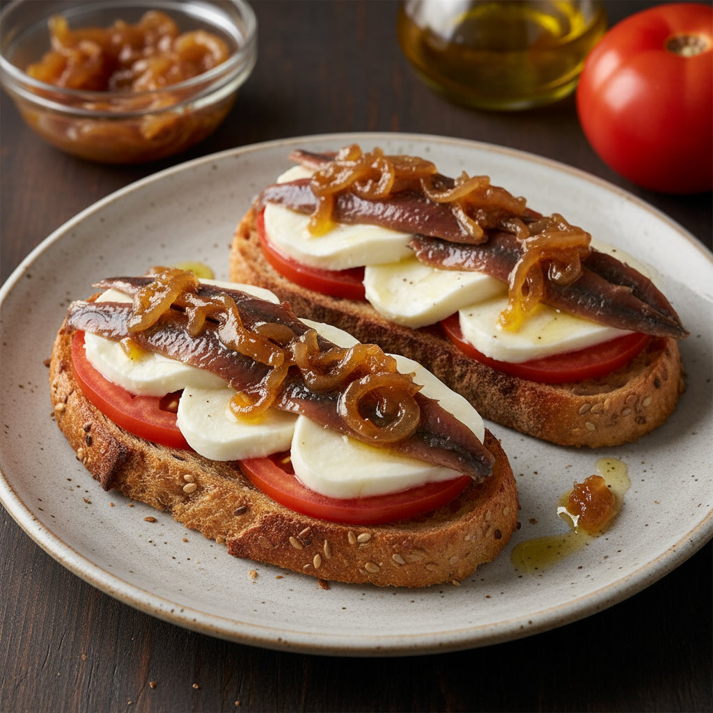 - Primero las rodajas de tomate - Después las de mozzarella - Sobre ello colocamos las anchoas - Ponemos un topping de cebolla caramelizada - Espolvoreamos sal ahumada al gusto - Vertemos unas gotas de aceite de oliva virgen extra en las tostadas y sobre el plato para decorar.